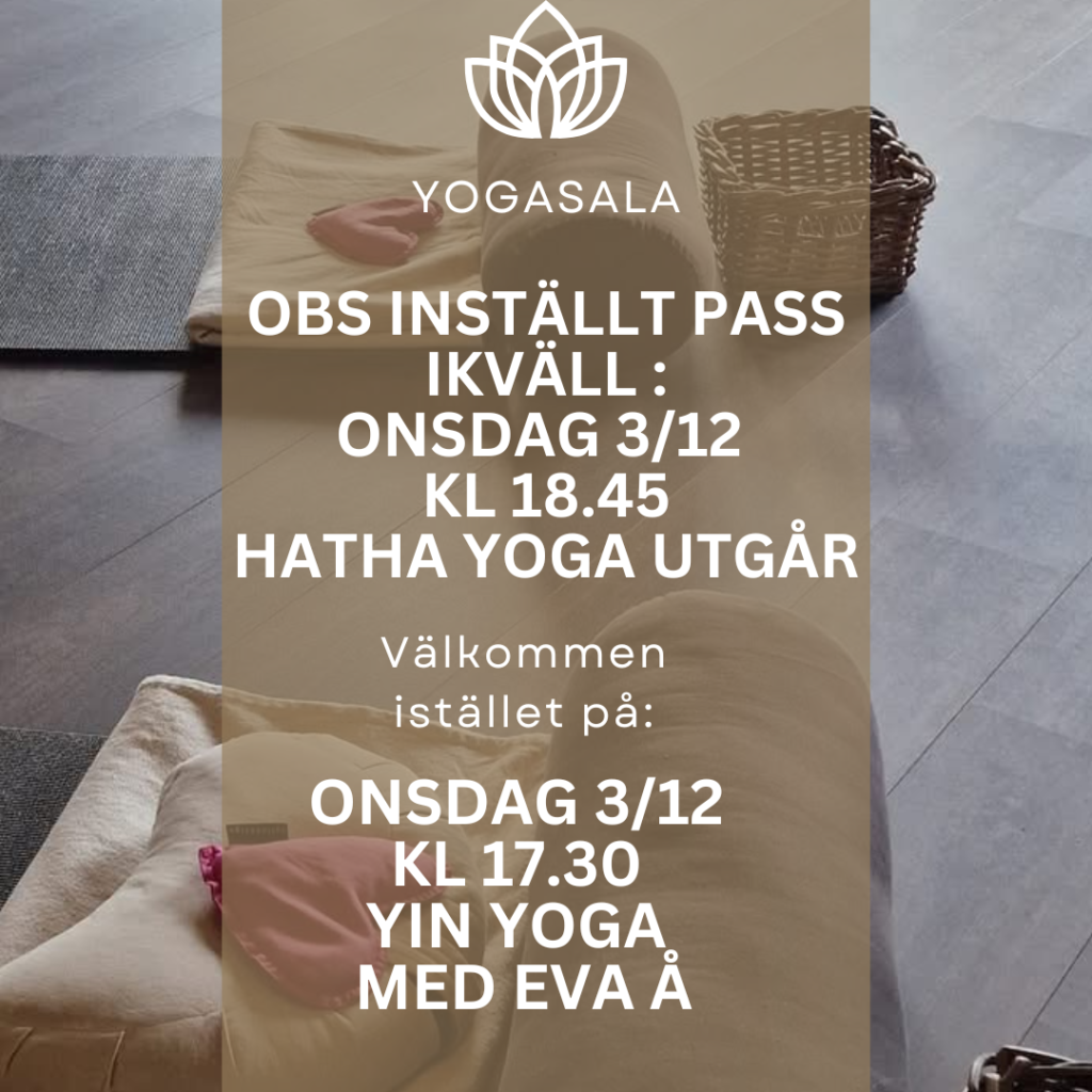 - OBS! Inställd Hatha Yoga ikväll ons 3/12 kl 18.45Tyvärr måste vi ställa in kvällens Hatha Yoga kl 18.45 med kort varsel pga sjukdom. Vi gör alltid allt för att undvika att ställa in pass hos oss men tyvärr hände det i dag. Vi ber om ursäkt och hoppas att ni har möjlighet att delta på en skön Yin Yoga …