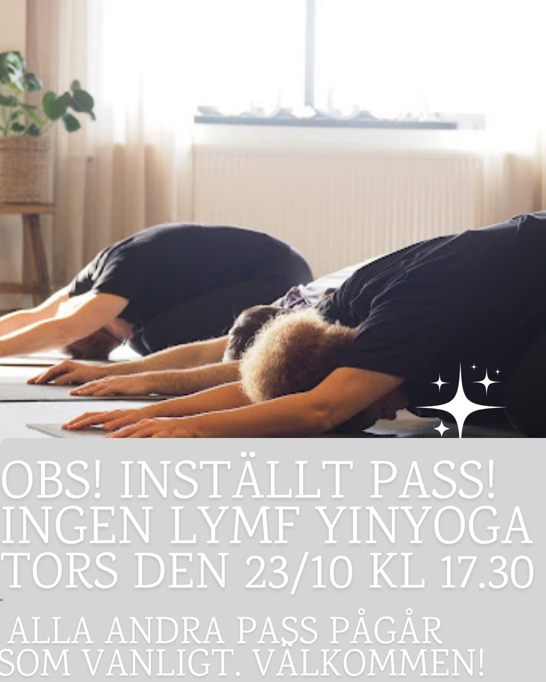 Torsdag den 23/10 och torsdag den 30/10 är det tyvärr ingen Lymf-YinYoga kl 17.30 med Eva Åberg pga sjukskrivning. Alla andra pass rullar på som vanligt. Varmt välkomna till oss!